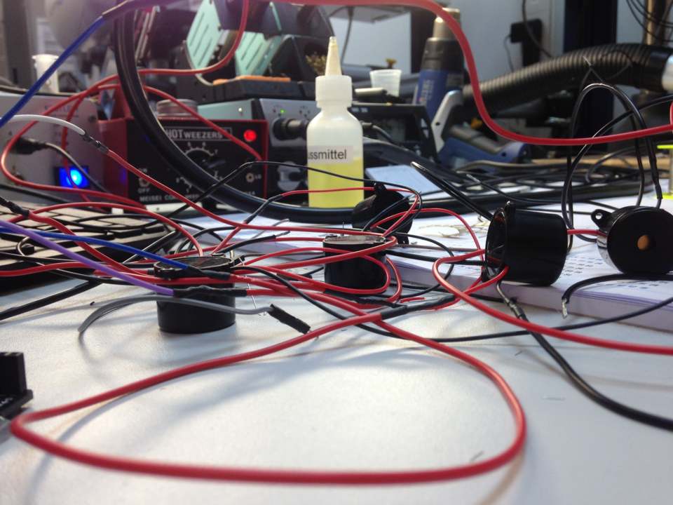 Das Schwierigste war ein geeignetes Thema für das Projekt zu finden, aber als dieses klar war, ging es dann doch ganz zügig: Vera baute und programmierte den EV3-Fahrroboter, Marvin kümmerte sich um Experten, die Standdekoration und die Finanzen, und Luc bastelte an den Sensoren und dem Arduino.