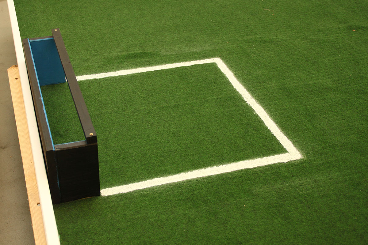 Untergrund: Es kommt keine PVC-Matte mehr zum Einsatz, sondern ein Rasenteppich. Wir verwenden für die Wettbewerbe in Deutschland den Kunstrasen der Firma Primaflor (Link zum Produkt). Diesen könnt ihr euch im Online-Shop der Firma in der Größe von 2m x 2,5m bestellen und entsprechend zuschneiden (Kostenpunkt: ca. 30 Euro). Weiße Linien für den Strafraum werden mit Farbe / Spray markiert.